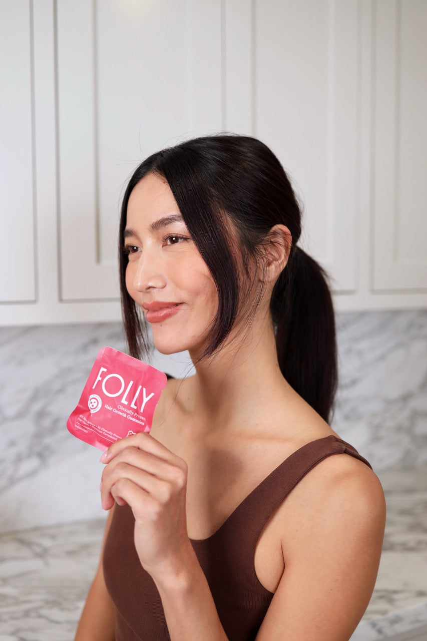 Folly’s biotech-powered delivery system supports visibly stronger, fuller-looking hair with consistent daily use.