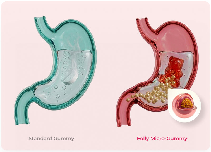 Traditional gummies expose nutrients to high heat during manufacturing and harsh stomach conditions during digestion. The result? 50–98% of nutrient potency is lost. That means less absorption, less consistency, and less support where it truly matters. Folly was created to change this - with patent-pending encapsulation technology.
