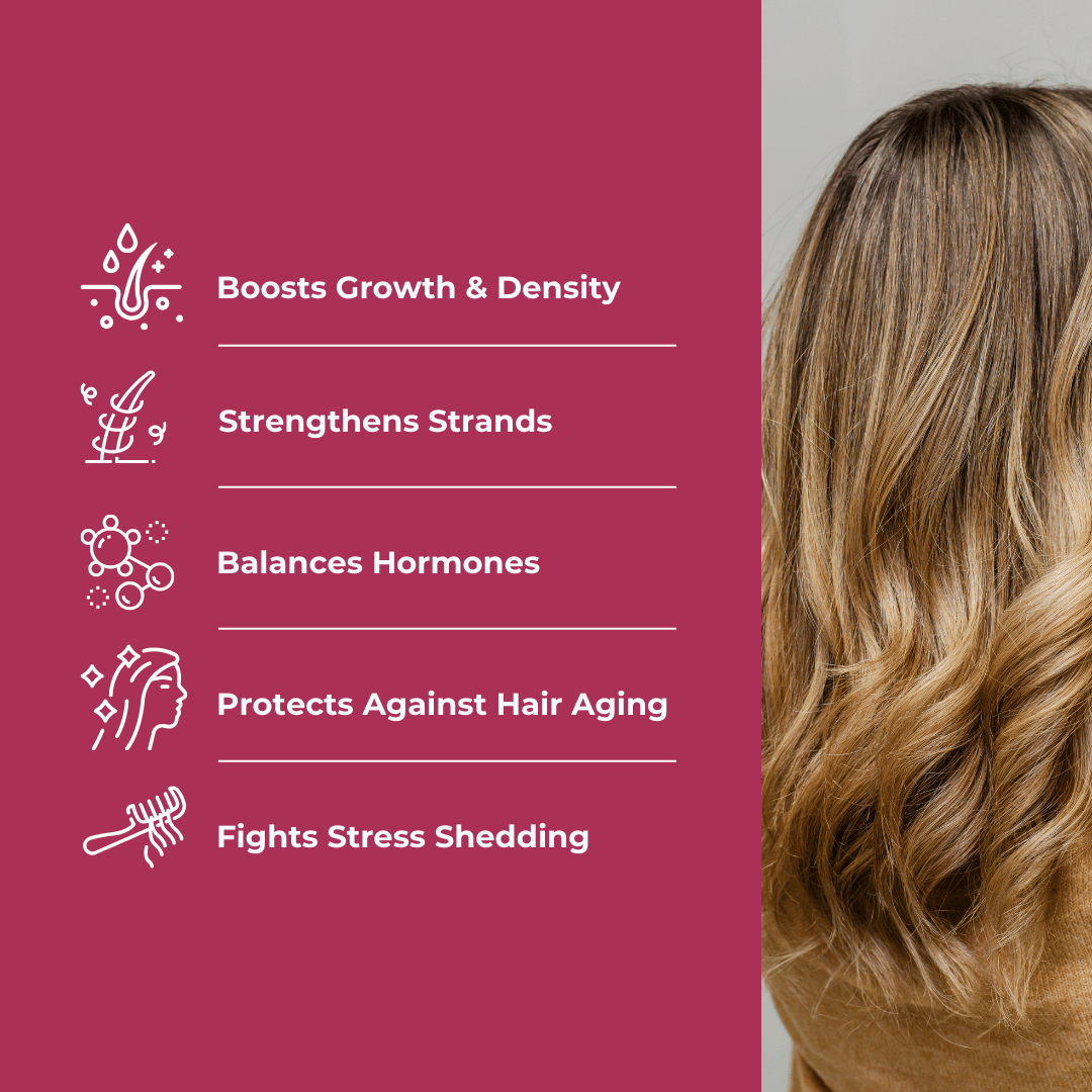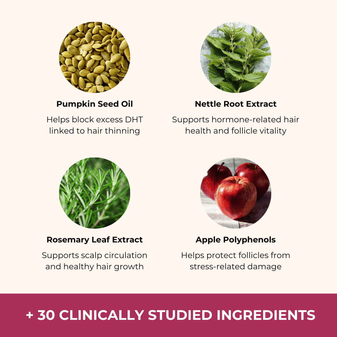 Every Folly gummy is powered by 30+ clinically studied ingredients, each designed to target a specific root cause of hair thinning — from hormonal imbalance to stress and circulation.