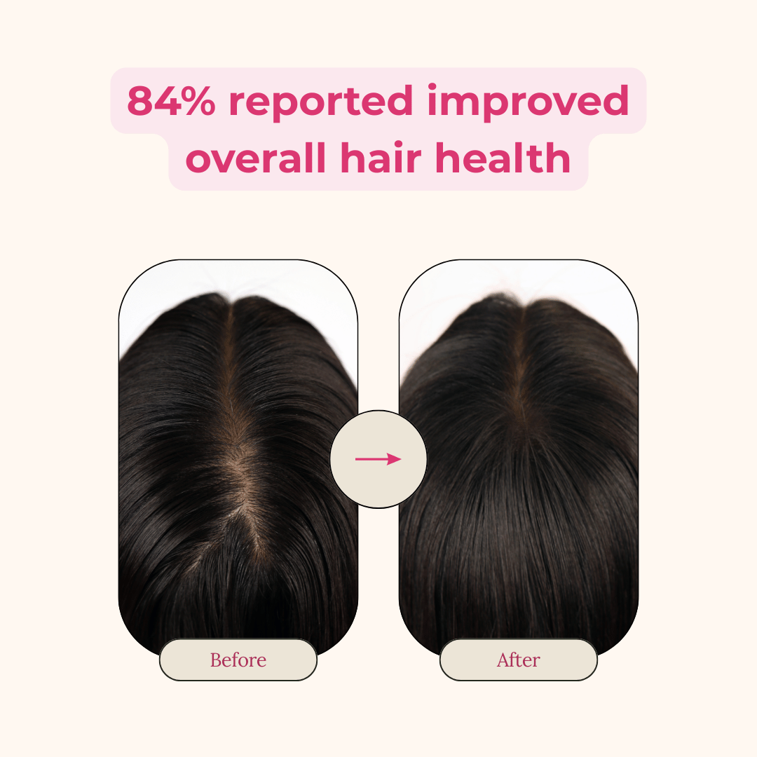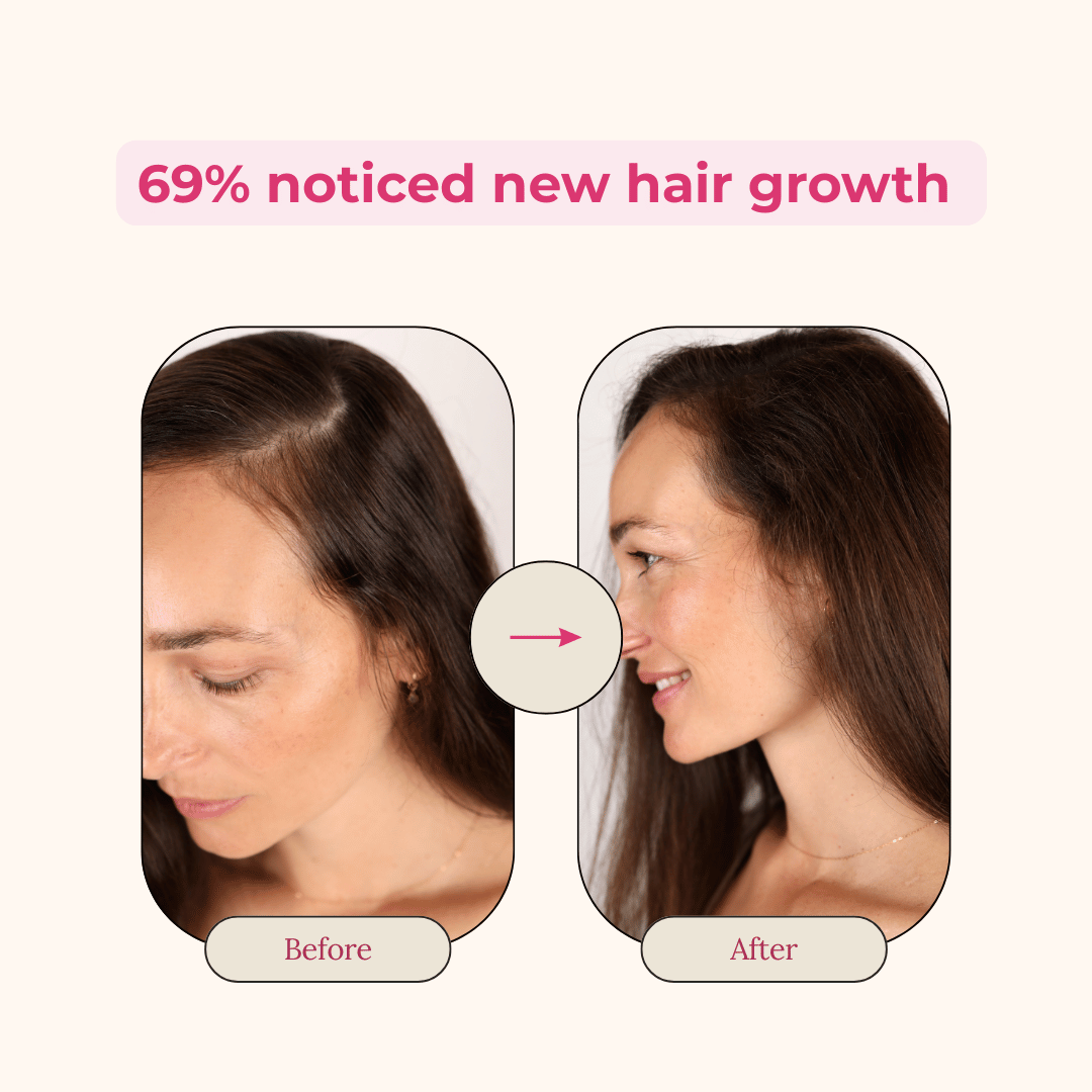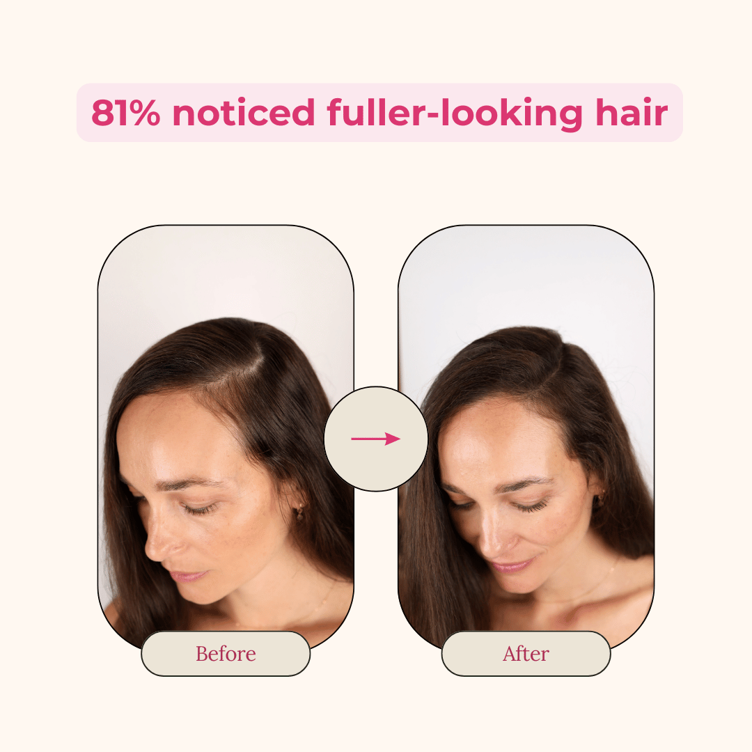 In a consumer perception study, 300 participants used Folly Hair Growth Gummies for at least four weeks. 84% reported improved overall hair health, 81% noticed fuller-looking hair, 79% experienced reduced shedding, and 69% noticed new hair growth or baby hairs. 82% said they would recommend Folly to a friend. Results are self-reported and individual results may vary.
