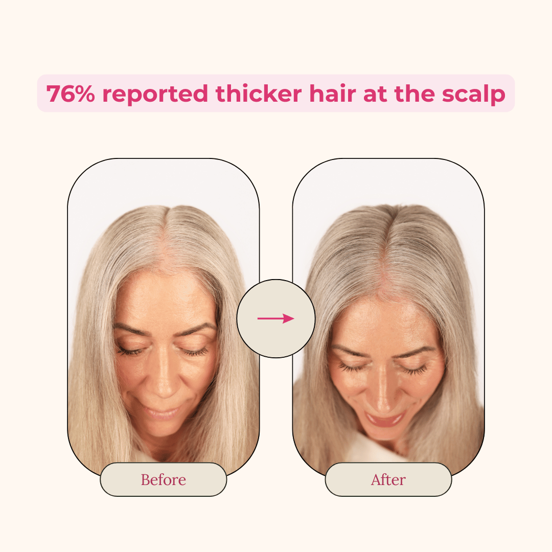 Hair health is shaped by hormones, stress, nutrition, circulation, and natural aging. Folly’s 30+ clinically studied ingredients work to support healthier, fuller-looking hair from within.*
