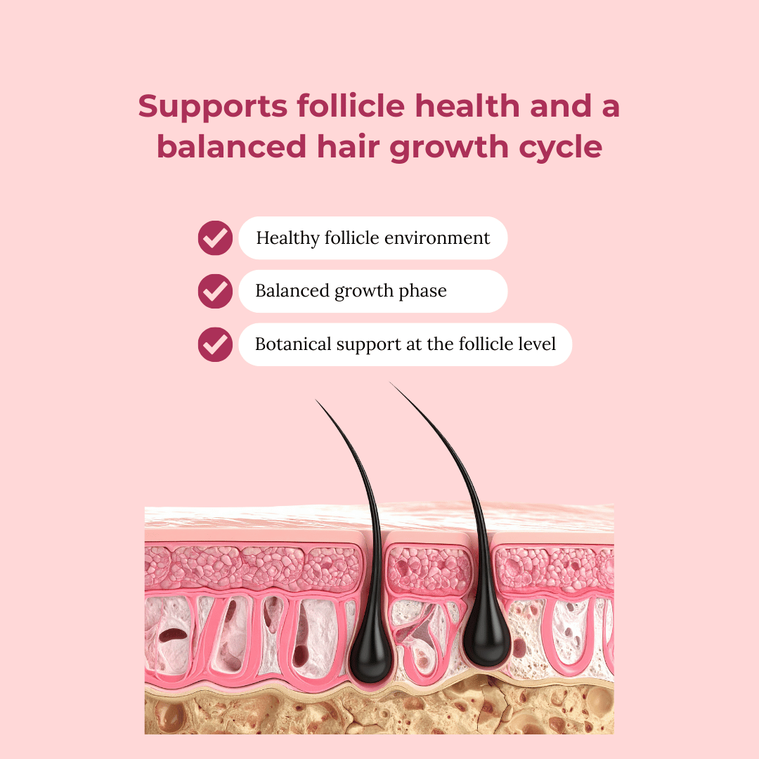 Hormones, cortisol, and inflammation all impact the follicle. Our blend includes ingredients shown to support balanced androgen activity and protect follicles from oxidative stress.*