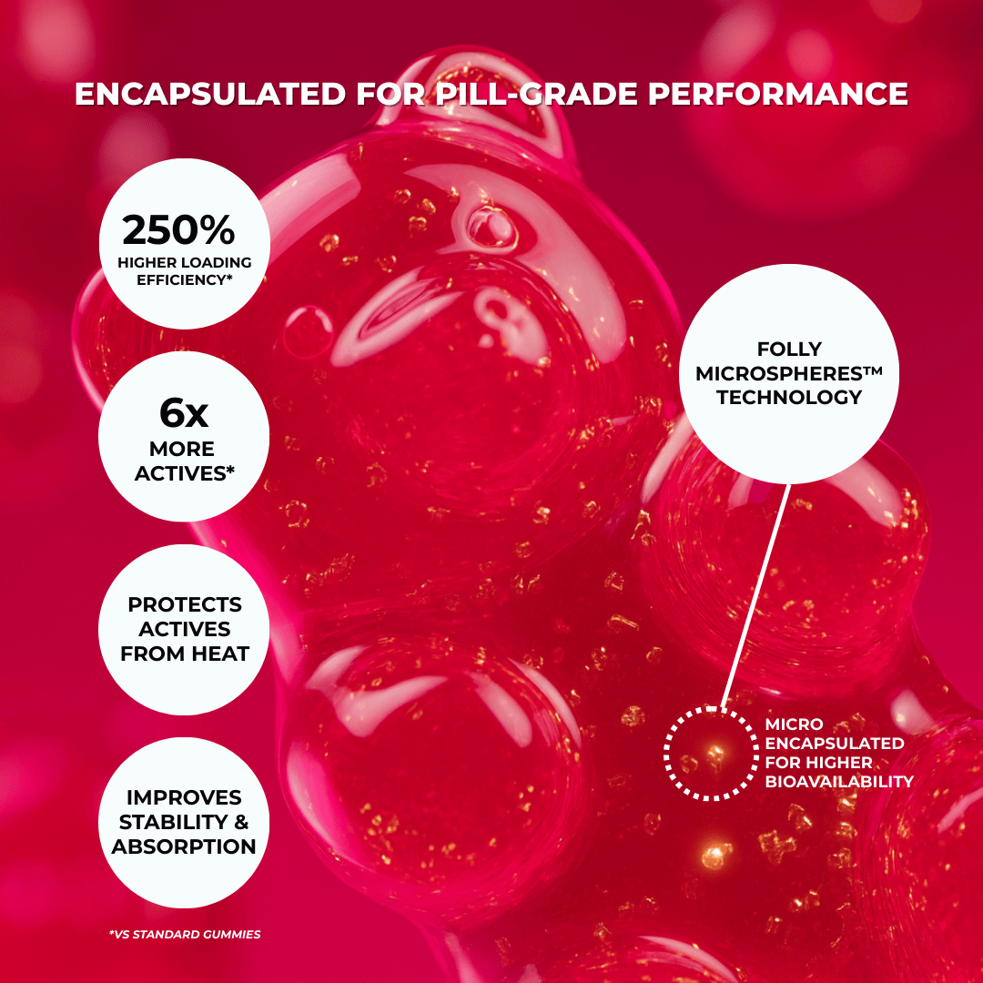 Most gummies lose potency during heat processing and can't carry meaningful doses. Folly uses dual-layer microencapsulation—Folly MicroSpheres™—to protect heat-sensitive ingredients through manufacturing, enabling 6× higher active loading and ~250% higher absorption than unencapsulated actives. The result: a gummy that actually delivers.